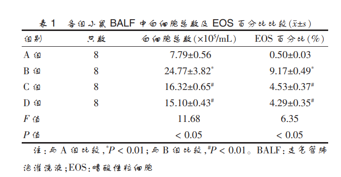 A 組小鼠氣道黏膜無增厚,氣道周圍無炎癥細胞 浸潤,肺泡壁結構完整;B 組小鼠氣道黏膜充血水腫, 氣道周圍較多炎癥細胞浸潤,肺泡結構被破壞;C 組 小鼠氣道周圍少量炎癥細胞浸潤,管壁無明顯增厚; D 組小鼠程度與 C 組小鼠相似。 見圖 1(封四)。2.3 各組小鼠 BALF 中白細胞總數和 EOS 百分比的 比較 與 A 組比 較,B 組小 鼠 BALF 中白 細 胞 總 數 和 EOS 百分比均顯著升高,差異有高度統計學意義(P < 0.01)。 與 B 組比較,C 組和 D 組小鼠 BALF 中白細胞 總數及 EOS 百分比明顯降低,差異有高度統計學意 義(P < 0.01)。C、D 兩組白細胞總數和 EOS 百分比比較, 差異無統計學意義(P > 0.05)。 見表 1。