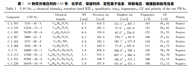6460 三重四極桿液質(zhì)聯(lián)用儀( 美國安捷倫公司) ; 5810R 冷凍離心機(jī)( 德國艾本德股份公司) ; R - 12 平行溶劑濃縮蒸發(fā)儀( 瑞士步琦有限公司) ; VORTEX KB - 3 渦旋振蕩器( 中國海門其林貝爾儀器制 造有限公司) ,MS105DU 電子天平( 美國梅特勒公司) 。 10 種熒光增白劑標(biāo)準(zhǔn)品: C. I. 393( 純度≥99. 7% ) 、C. I. 135( 純度≥99. 8% ) 、C. I. 185( 純度≥ 98. 1% ) 、C. I. 367( 純度≥99. 9% ) 、C. I. 162( 純度≥95% ) 、C. I. 368( 純度≥97. 9% ) 購于上海安譜公 司; C. I. 71( 146 μg /mL) 、C. I. 113( 108 μg /mL) 、C. I. 353( 103 μg /mL) 、C. I. 220( 101 μg /mL) 為購于 福州綠川生物科技有限公司的混合對(duì)照品。甲醇、乙腈( 色譜純,Merck 公司) ,PSA、C18 ( Welch 公 司) 。