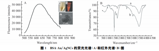 圖1A 為 BSA-Au/AgNCs在激發(fā)波長(zhǎng)280nm 處的熒光光譜圖,由圖可見(jiàn)最大發(fā)射波長(zhǎng)為625nm。 這些熒光特征與報(bào)道的基本一致,表明實(shí)驗(yàn)已經(jīng)成功合成了 BSA-Au/AgNCs。日 光 下 制 備 的 BSA-Au/AgNCs呈棕黃色(如圖1A 插圖a),而在365nm 的紫外燈下顯示出很強(qiáng)的橘紅色熒光,如圖1 插圖b所示。 圖1 BSA-Au/AgNCs的熒光光譜(A)和紅外光譜(B)圖 Fig.1 Fluorescencespectra(A)andIRspectra(B)ofBSA-Au/AgNCs InsetainFig.A:ImageofBSA-Au/AgNCsunderthedaylightlamp;Insetb:ImageofBSA-Au/AgNCsunder365nm UVlight; Insetc:HRTEMimageofBSA-Au/AgNCs. 利用高分辨透射電鏡(HRTEM)研究了合成的 BSA-Au/AgNCs的尺寸。如圖1插圖c所示,可以觀 察到合成的 BSA-Au/AgNCs尺寸約4nm,表明 BSA-Au/AgNCs具有高度結(jié)晶的結(jié)構(gòu)。利用紅外光譜 表征了 BSA-Au/AgNCs的結(jié)構(gòu)信息,結(jié)果如圖1B所示。其中曲線a為 BSA-Au/AgNCs的紅外譜,曲線 b為 BSA 的紅外光譜。與 BSA 的紅外光譜相比,BSA-Au/AgNCs的紅外光譜在1654cm-1的特征吸收 峰有較為明顯的減弱,這表明反應(yīng)后蛋白質(zhì)的α 螺旋結(jié)構(gòu)減少了,蛋白質(zhì)的二級(jí)結(jié)構(gòu)發(fā)生了改變,同時(shí)在 蛋白質(zhì)中巰基與 Au、Ag形成共價(jià)鍵。