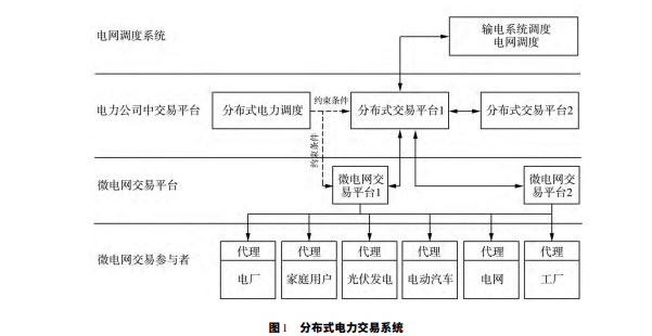 本研究的對(duì)象是由住宅負(fù)載、工業(yè)負(fù)載和分布 式能源組成的分布式微電網(wǎng)。分布式電源可分為光伏發(fā)電系統(tǒng)、風(fēng)力發(fā)電系統(tǒng)或電池儲(chǔ)能系統(tǒng)。每個(gè) 節(jié)點(diǎn)與本地對(duì)等電力交易中的參與者相關(guān)聯(lián)。微電 網(wǎng)有一個(gè)參與電力交易的電力系統(tǒng)運(yùn)營商( DSO) , 需要利用電力交易來激勵(lì)微電網(wǎng)定時(shí)輸出電能,以 提高電網(wǎng)穩(wěn)定和降低用電成本。電力交易操作通常 分為三個(gè)階段: 發(fā)現(xiàn)合理的售電報(bào)價(jià)、購買要約與銷 售報(bào)價(jià)的匹配以及匹配完成后的電力交易處理。 所研究的電力交易解決方案需要滿足以下五個(gè)基本要求。第一個(gè)要求是存在適當(dāng)?shù)耐ㄐ藕拖?遞架構(gòu)。分布式平臺(tái)必須收集參與者的報(bào)價(jià)并將其 提供給買方和賣方,市場(chǎng)算法必須傳達(dá)清算價(jià)格和 買賣雙方的匹配。這些信息必須在嚴(yán)格的時(shí)間限制 下可靠地傳遞,這些限制源自交易必須清除的最后 期限。第二,交易活動(dòng)不得損害物理系統(tǒng)操作的穩(wěn) 定性。