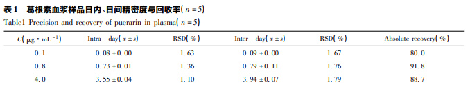取上述對照品儲備液分別配制成 3 種質量濃度 ( 0. 1,0. 8,4. 0 μg·mL - 1 ) 的葛根素樣品溶液,按照 “血漿預處理方法”進行處理后,分別進樣 10 μL,測 定峰面積,分別于日內進樣 5 次,考察日內精密度; 每 天同一時間進樣 1 次,共進樣 5 d,考察日間精密度。 另取血漿樣品,分別配制成 3 種質量濃度( 0. 1,0. 8, 4. 0 μg·mL - 1 ) 的葛根素樣品溶液,按照“血漿預處理 方法”進行處理后,分別進樣測定峰面積,以兩者峰面 積相比,計算出葛根素在血漿提取中的絕對回收率。
