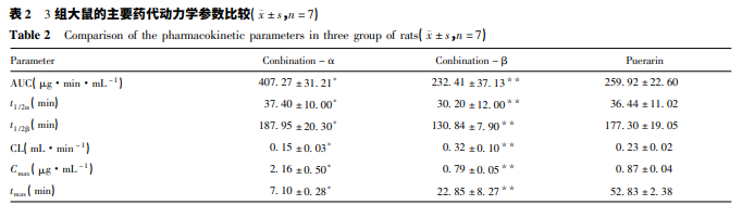 葛根素、聯合 α 組和聯合 β 組的大鼠體內藥代動 力學過程均符合兩房室模型。聯合 α 組與葛根素組 比較,AUC、t1 /2α、t1 /2β和 Cmax均明顯增加,差異均有統 計學意義( 均 P < 0. 05) ; 聯合 β 組與葛根素組比較, AUC、t1 /2α、t1 /2β和 Cmax均明顯降低,差異均有統計學意 義( 均 P < 0. 05) 。結果見表 2。